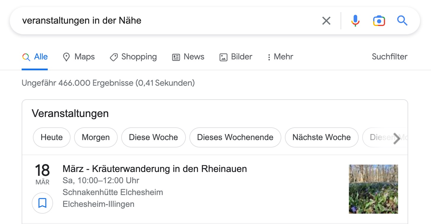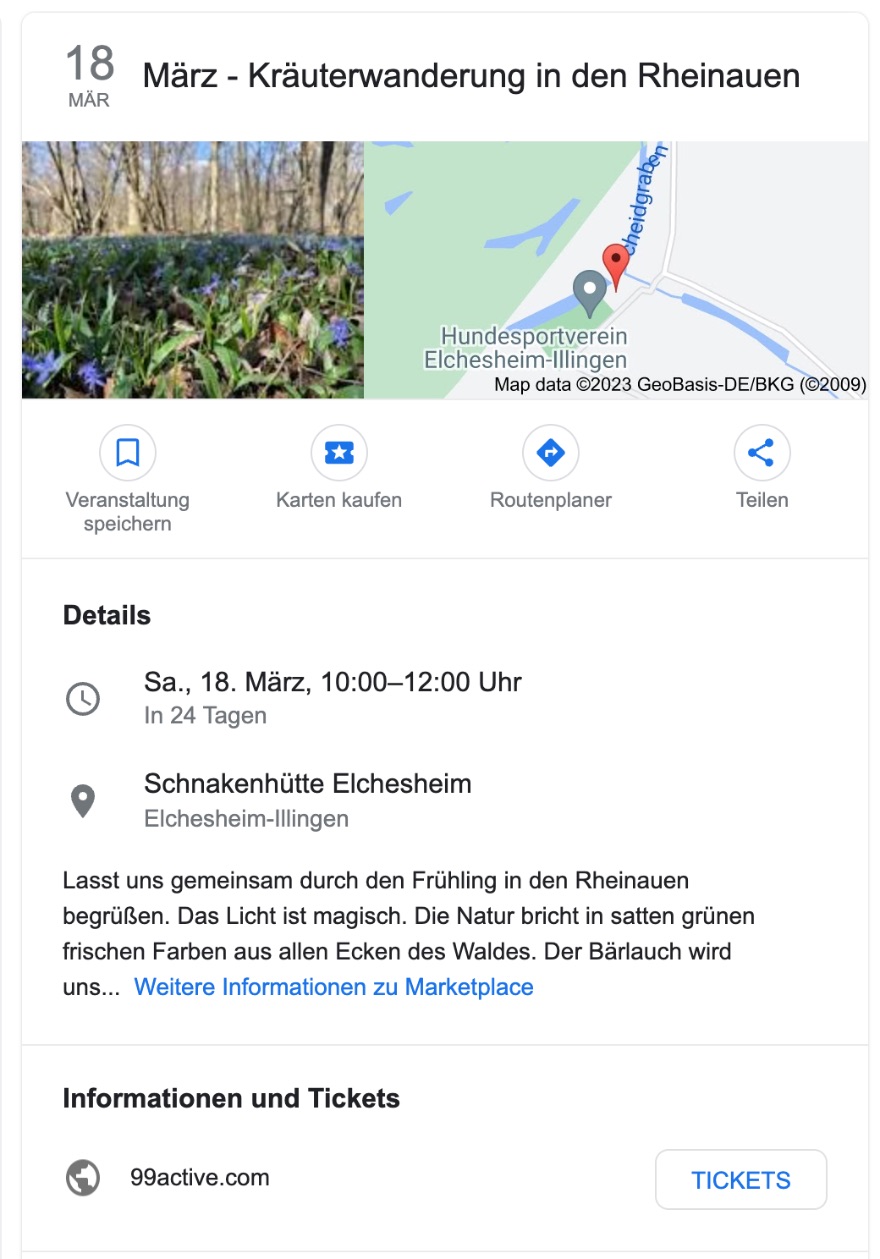 Wir erstellen einen Google Event (Veranstaltung) für deine Kräutertour. Damit bekommt deine Tour eine größere Sichtbarkeit. Jeder der im Internet nach "Veranstaltungen in der Nähe" sucht oder nach "Kräutertour", wird dein Angebot im Ergebnis der Suche angezeigt bekommen. Im Bereich "Informationen und Tickets" steht im Suchergebnis 99active.com mit dem Button "Tickets". Deine Kunden kommen einfach und komfortabel an ihr Ticket und deine Teilnehmerliste füllt sich.