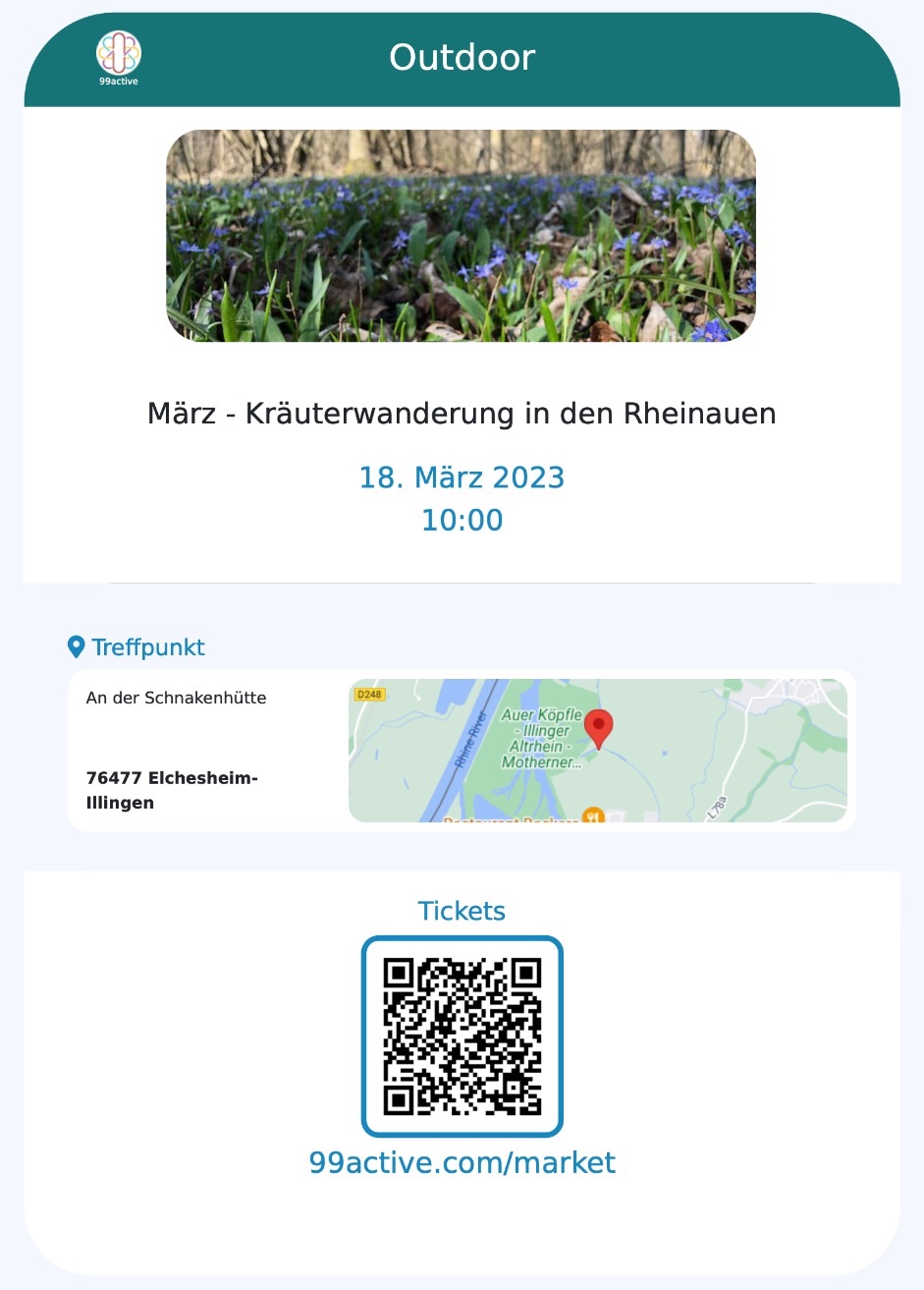 cross-sharing auf Social Media implementiert, damit dein von so vielen Menschen wie möglich gesehen wird. Unser Marktplatz ist auf Facebook veröffentlicht, was bedeutet, dass potentielle Kunden auf Facebook nach "Kräutertour" suchen und deinen dort finden können. Auf diese Weise werden sie auf dich aufmerksam und kehren zu 99active zurück, um ihr Ticket zu buchen. Deine Teilnehmerliste wird sich schnell füllen.